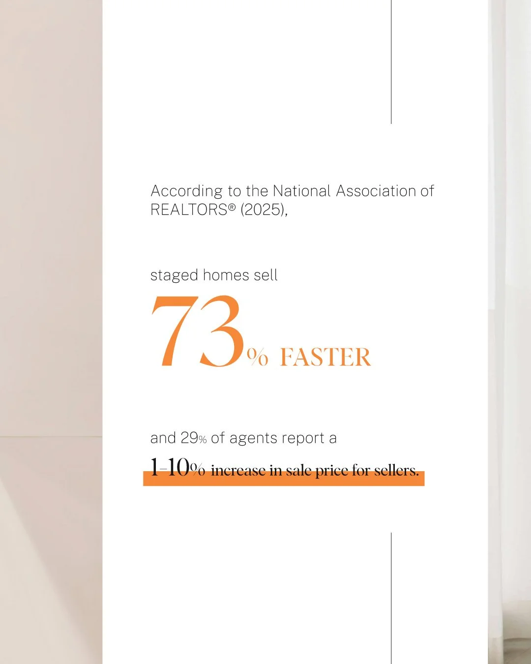 Staged homes sell 73% faster and can increase sale price by up to 10% (NAR 2025).