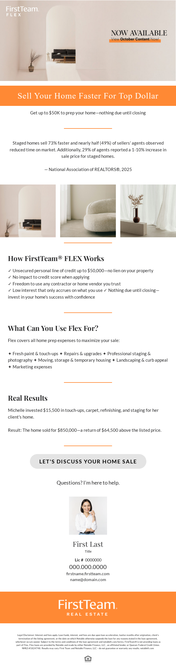 This month, we’re helping you WIN more listings by showcasing the FirstTeam® FLEX program as a true competitive advantage. FLEX gives sellers up to $50,000 to prep their home for market—with nothing due until closing. That means no more “I can’t afford to fix it” objections and a stronger listing presentation.